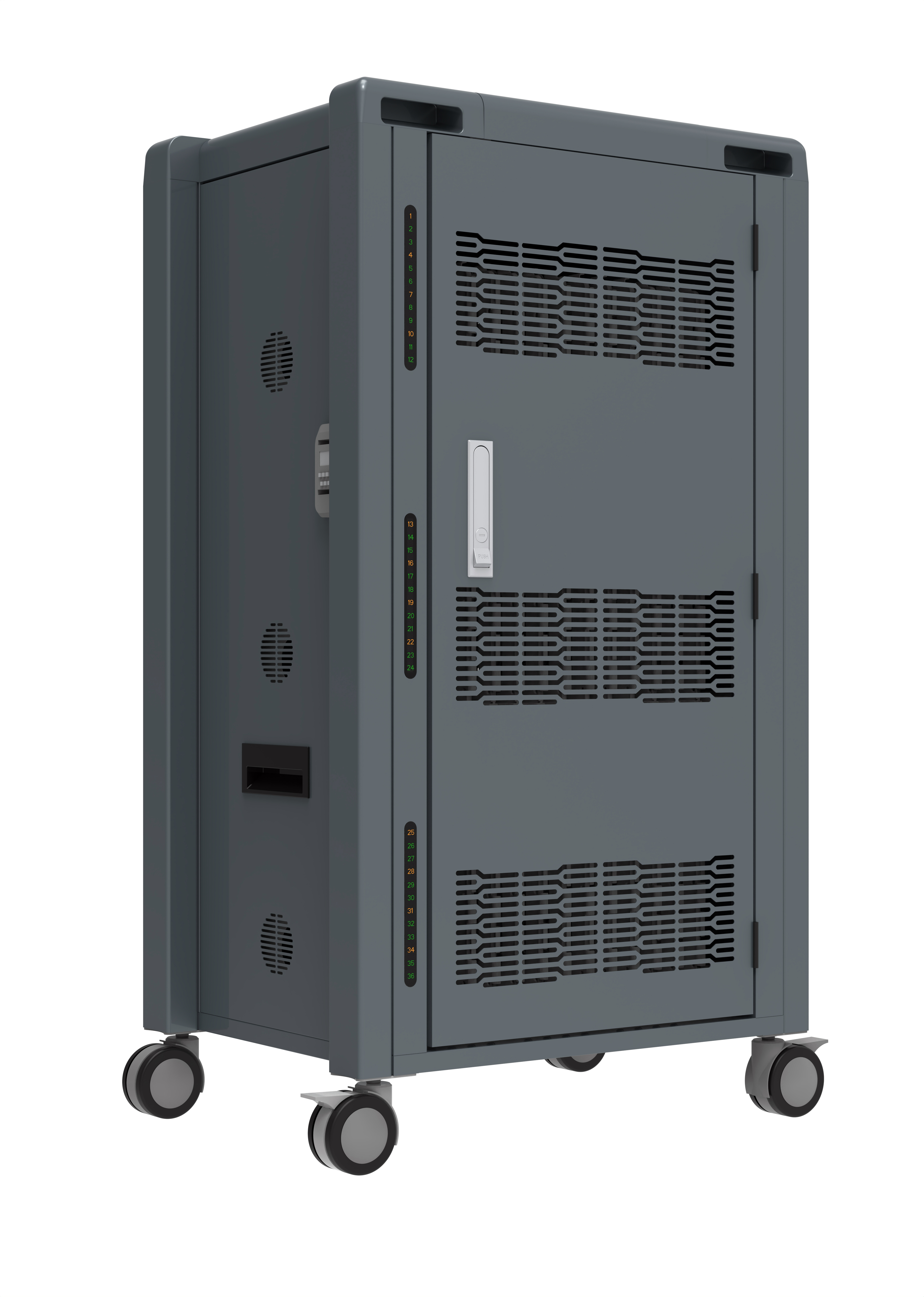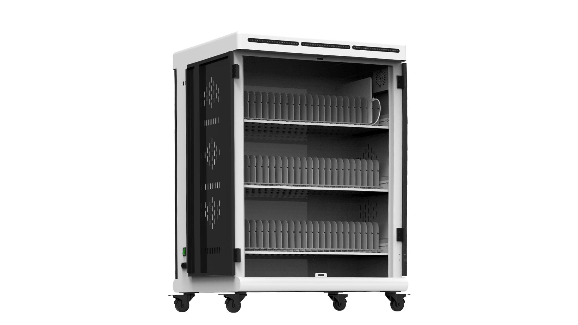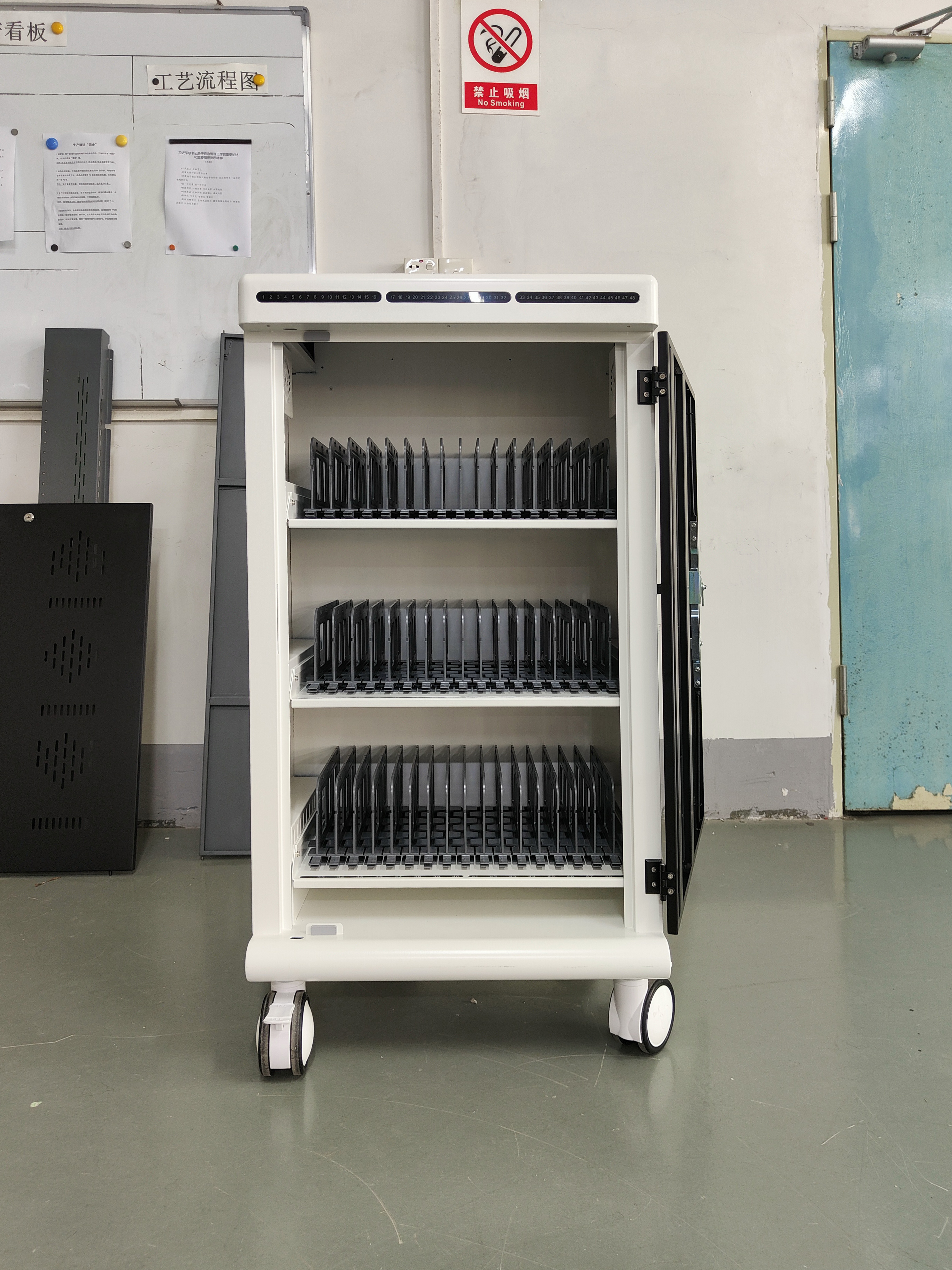 使用充電柜前,首先需要將其放置在堅實平整的地面上,確保腳輪已鎖定。然后打開柜門,將平板電腦逐一放入專用放置槽內。放置時應注意將設備充電口朝向USB數據線方向,便于后續連接。