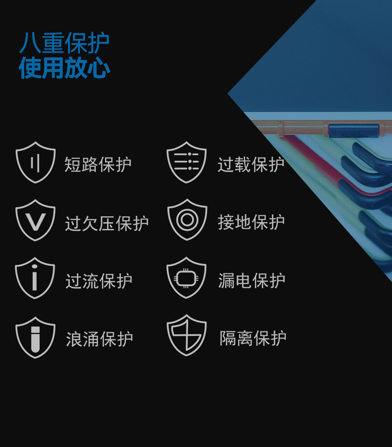 4.漏電保護:快速型漏電保護裝置,雙重漏電保護,防止人身觸電和漏電,保障安全(S4)