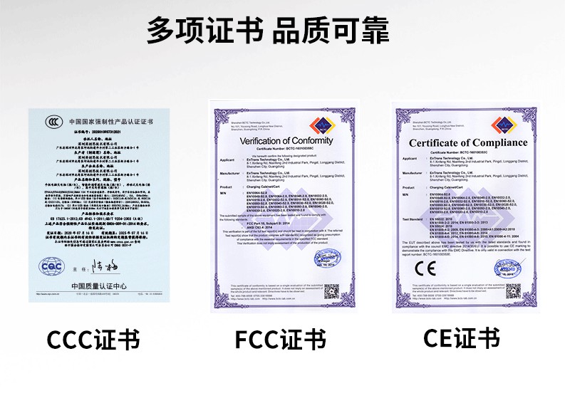 整機通過國家CCC強制認證,防輻射FCC認證以及CE認證,材料對人體安全性CA65認證,REACH和RoHs認證